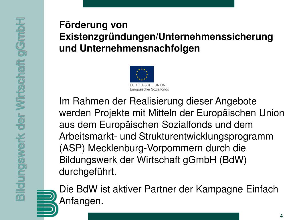 Förderung von Existenzgründungen/Unternehmenssicherung und Unternehmensnachfolgen Im Rahmen der Realisierung dieser Angebote werden Projekte mit Mitteln der Europäischen Union aus dem Europäischen Sozialfonds und dem Arbeitsmarkt- und Strukturentwicklungsprogramm (ASP) Mecklenburg-Vorpommern durch die Bildungswerk der Wirtschaft gGmbH (BdW) durchgeführt. Die BdW ist aktiver Partner der Kampagne Einfach Anfangen.