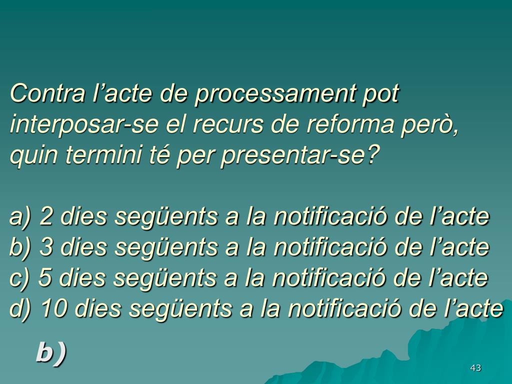 Contra l’acte de processament pot interposar-se el recurs de reforma però, quin termini té per presentar-se?a) 2 dies següents a la notificació de l’acteb) 3 dies següents a la notificació de l’acte c) 5 dies següents a la notificació de l’acte d) 10 dies següents a la notificació de l’acte b)