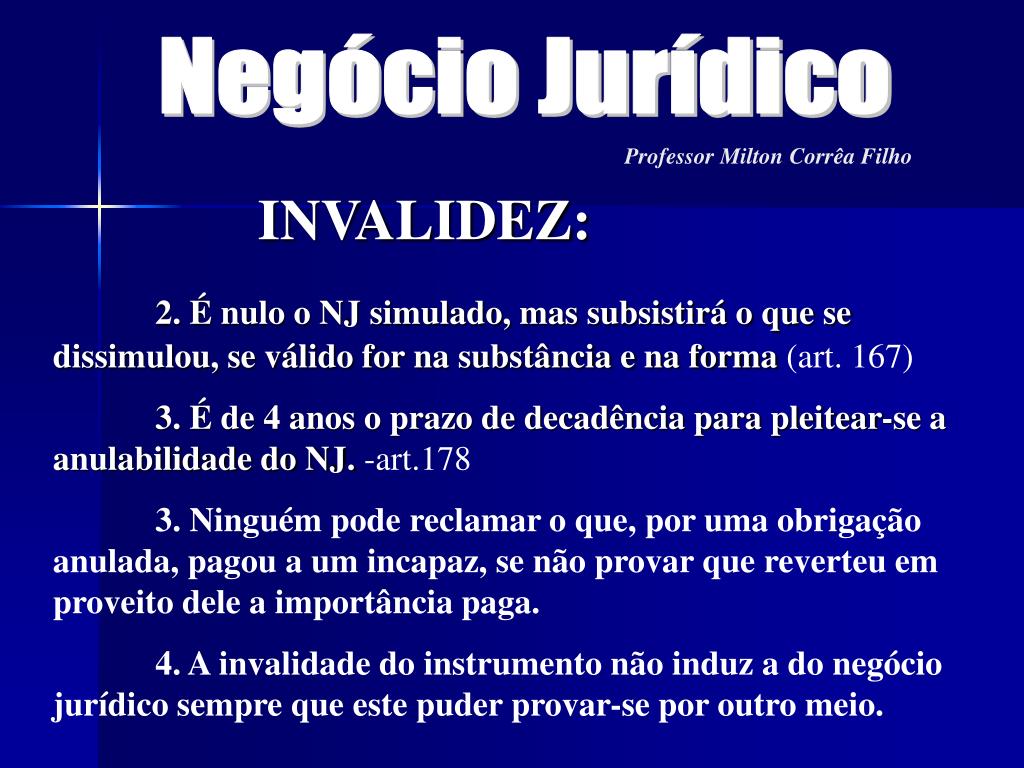 Negócio Jurídico Professor Milton Corrêa Filho INVALIDEZ: 2. É nulo o NJ simulado, mas subsistirá o que se dissimulou, se válido for na substância e na forma (art. 167) 3. É de 4 anos o prazo de decadência para pleitear-se a anulabilidade do NJ. -art.178 3. Ninguém pode reclamar o que, por uma obrigação anulada, pagou a um incapaz, se não provar que reverteu em proveito dele a importância paga. 4. A invalidade do instrumento não induz a do negócio jurídico sempre que este puder provar-se por outro meio.