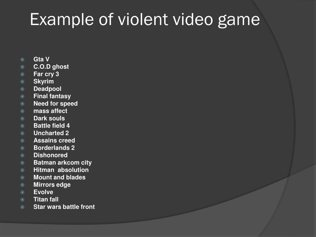 Example of violent video game • Gta V • C.O.D ghost • Far cry 3 • Skyrim • Deadpool • Final fantasy • Need for speed • mass affect • Dark souls • Battle field 4 • Uncharted 2 • Assains creed • Borderlands 2 • Dishonored • Batman arkcom city • Hitman absolution • Mount and blades • Mirrors edge • Evolve • Titan fall • Star wars battle front