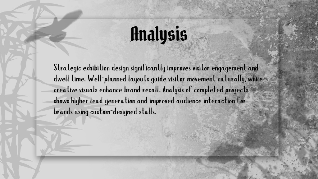 6. Analysis Strategic exhibition design significantly improves visitor engagement and dwell time. Well-planned layouts guide visitor movement naturally, while creative visuals enhance brand recall. Analysis of completed projects shows higher lead generation and improved audience interaction for brands using custom-designed stalls.