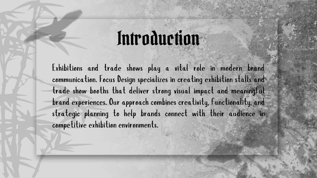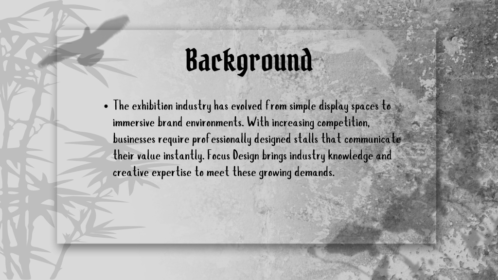 4. Background The exhibition industry has evolved from simple display spaces to immersive brand environments. With increasing competition, businesses require professionally designed stalls that communicate their value instantly. Focus Design brings industry knowledge and creative expertise to meet these growing demands.