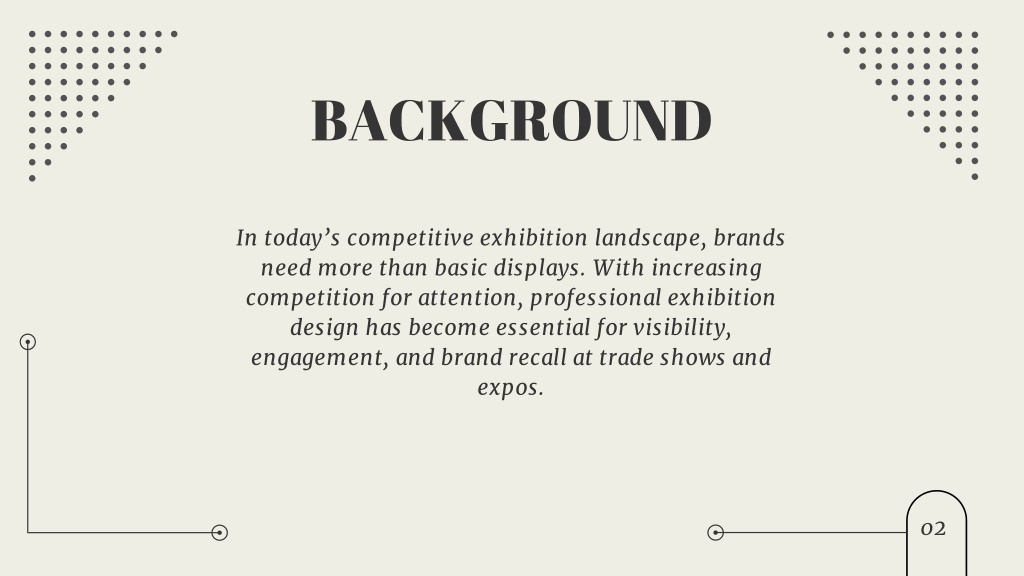 3. BACKGROUND In today’s competitive exhibition landscape, brands need more than basic displays. With increasing competition for attention, professional exhibition design has become essential for visibility, engagement, and brand recall at trade shows and expos. 02
