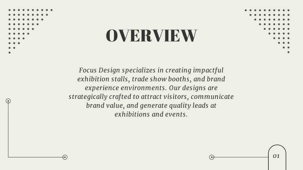 2. OVERVIEW Focus Design specializes in creating impactful exhibition stalls, trade show booths, and brand experience environments. Our designs are strategically crafted to attract visitors, communicate brand value, and generate quality leads at exhibitions and events. 01