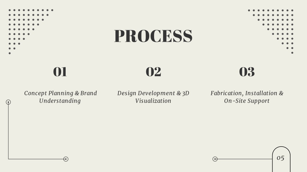 6. PROCESS 01 02 03 Concept Planning & Brand Understanding Design Development & 3D Visualization Fabrication, Installation & On-Site Support 05