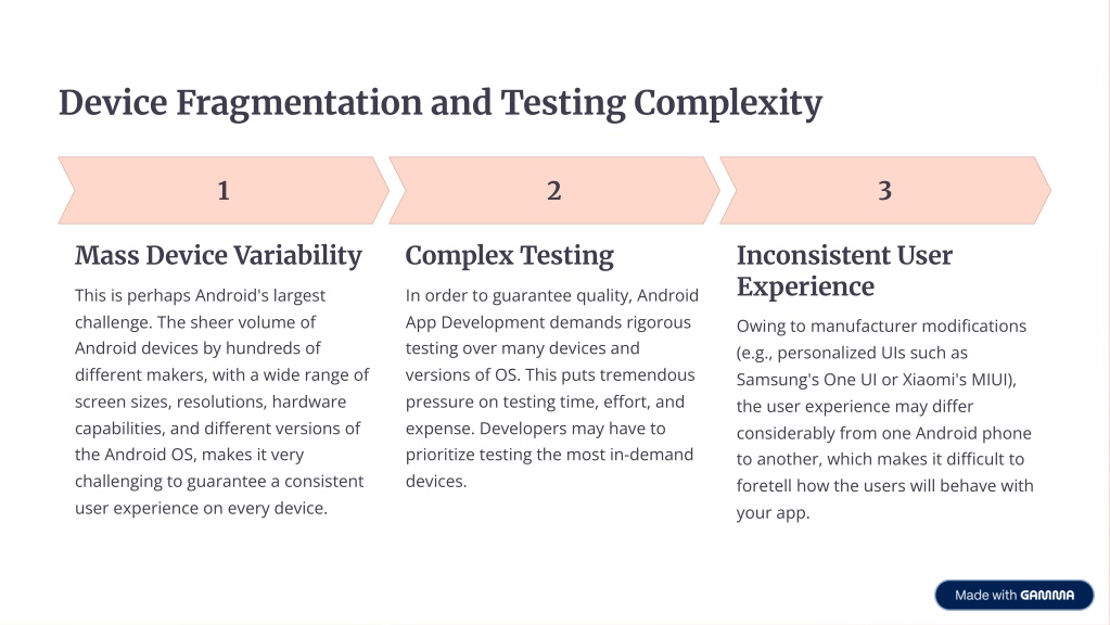 Device Fragmentation and Testing Complexity 1 2 3 Mass Device Variability Complex Testing Inconsistent User Experience This is perhaps Android's largest challenge. The sheer volume of Android devices by hundreds of different makers, with a wide range of screen sizes, resolutions, hardware capabilities, and different versions of the Android OS, makes it very challenging to guarantee a consistent user experience on every device. In order to guarantee quality, Android App Development demands rigorous testing over many devices and versions of OS. This puts tremendous pressure on testing time, effort, and expense. Developers may have to prioritize testing the most in-demand devices. Owing to manufacturer modifications (e.g., personalized UIs such as Samsung's One UI or Xiaomi's MIUI), the user experience may differ considerably from one Android phone to another, which makes it difficult to foretell how the users will behave with your app.