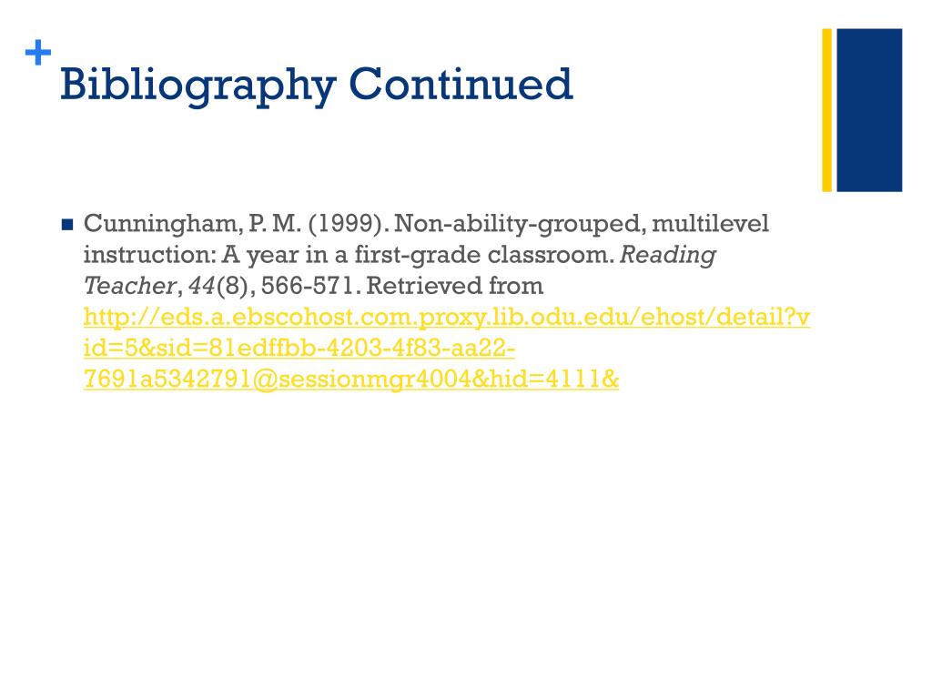 Bibliography Continued • Cunningham, P. M. (1999). Non-ability-grouped, multilevel instruction: A year in a first-grade classroom. Reading Teacher, 44(8), 566-571. Retrieved from http://eds.a.ebscohost.com.proxy.lib.odu.edu/ehost/detail?vid=5&sid=81edffbb-4203-4f83-aa22-7691a5342791@sessionmgr4004&hid=4111&