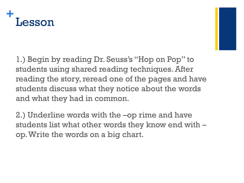 Lesson 1.) Begin by reading Dr. Seuss’s “Hop on Pop” to students using shared reading techniques. After reading the story, reread one of the pages and have students discuss what they notice about the words and what they had in common. 2.) Underline words with the –op rime and have students list what other words they know end with –op. Write the words on a big chart.