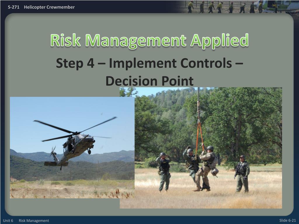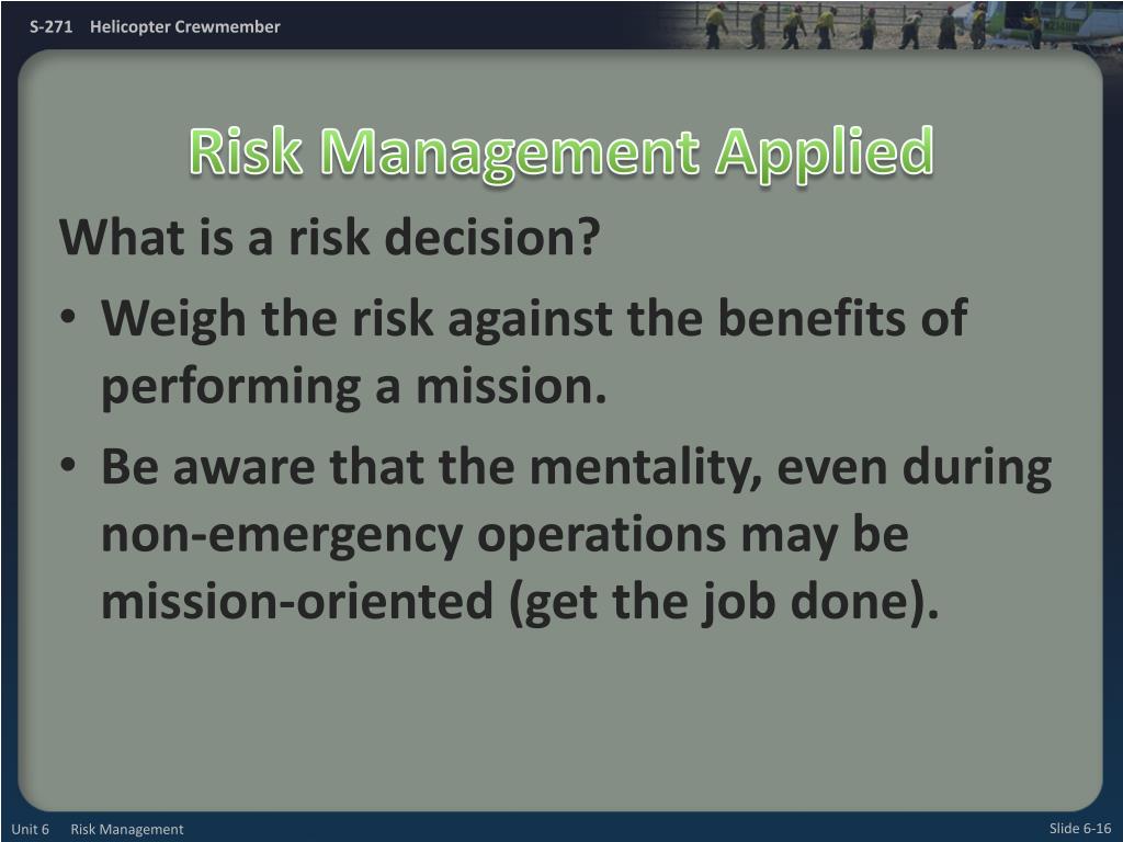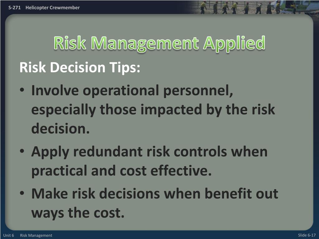 Risk Management Applied Unit 6 Risk Management Who should make a risk decision? Decision should be made at the level that corresponds to the degree of risk associated with that mission. Majority of the decisions that you will be associated with will be made by the Helicopter Manager.