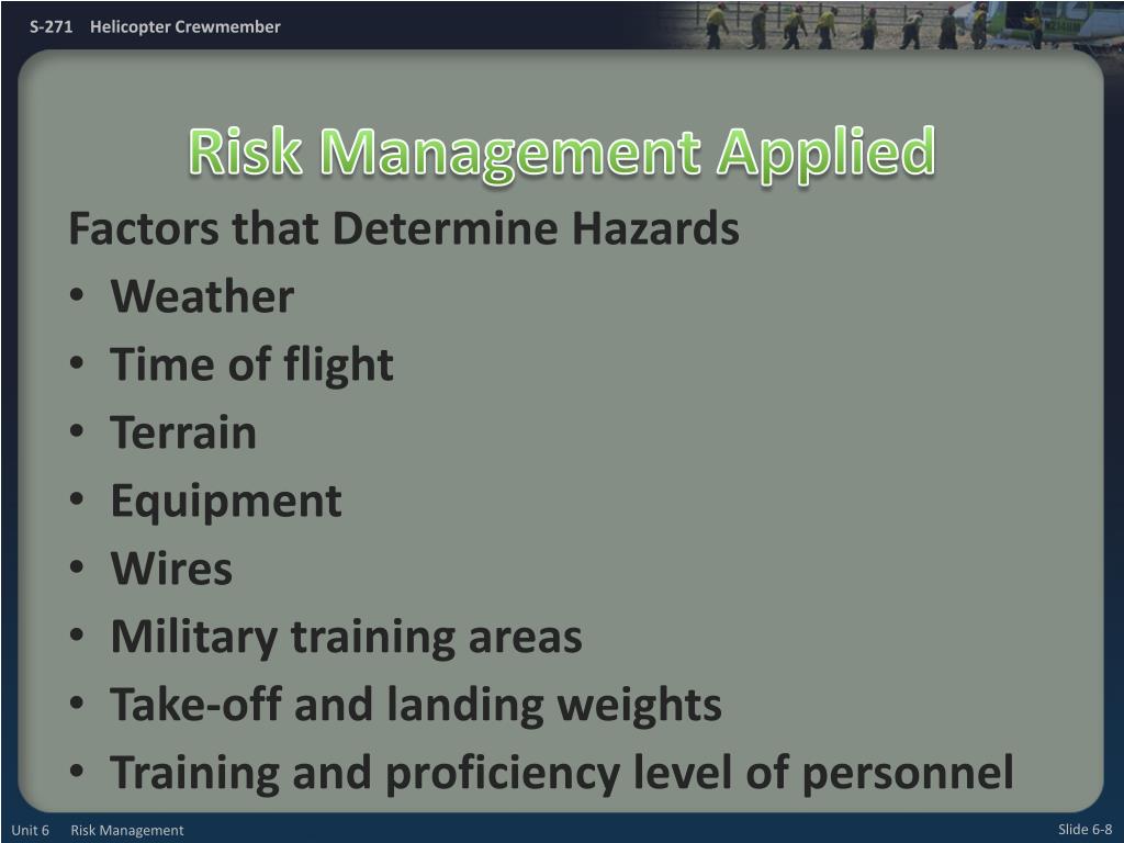 Risk Management Applied Unit 6 Risk Management Factors that Determine Hazards • Weather • Time of flight • Terrain • Equipment • Wires • Military training areas • Take-off and landing weights • Training and proficiency level of personnel