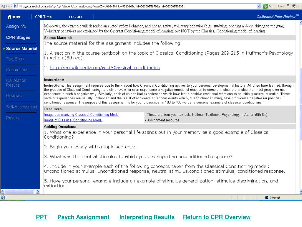 Calibrated Peer Review • Web-based program that enables frequent writing assignments with minimal impact on instructor time • Uses peer review • Promotes deeper learning Arlene RussellCo-developer of CPR Videos 123 PPT ~ Psych Assignment Interpreting Results ~ Skip