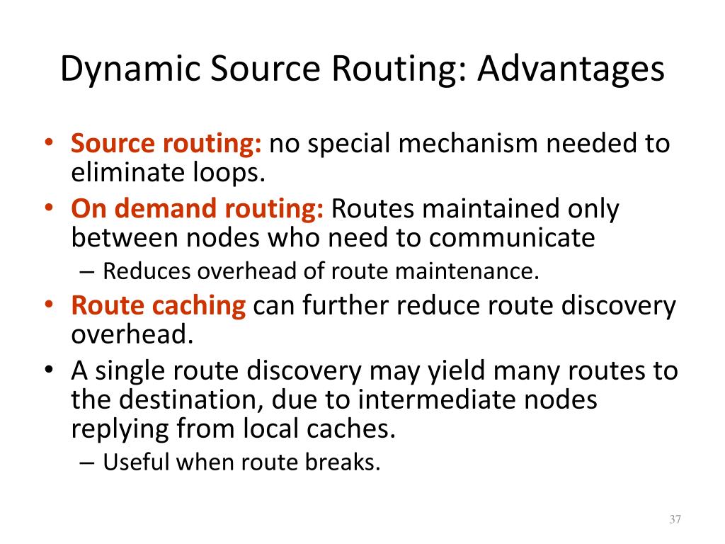 Dynamic Source Routing: Advantages • Source routing: no special mechanism needed to eliminate loops. • On demand routing: Routes maintained only between nodes who need to communicate • Reduces overhead of route maintenance. • Route caching can further reduce route discovery overhead. • A single route discovery may yield many routes to the destination, due to intermediate nodes replying from local caches. • Useful when route breaks.