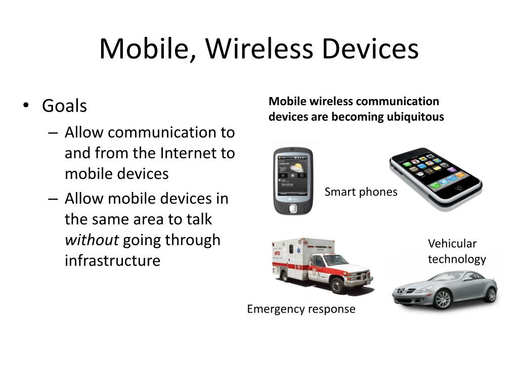 Mobile, Wireless Devices Mobile wireless communication devices are becoming ubiquitous • Goals • Allow communication to and from the Internet to mobile devices • Allow mobile devices in the same area to talk without going through infrastructure Smart phones Vehicular technology Emergency response