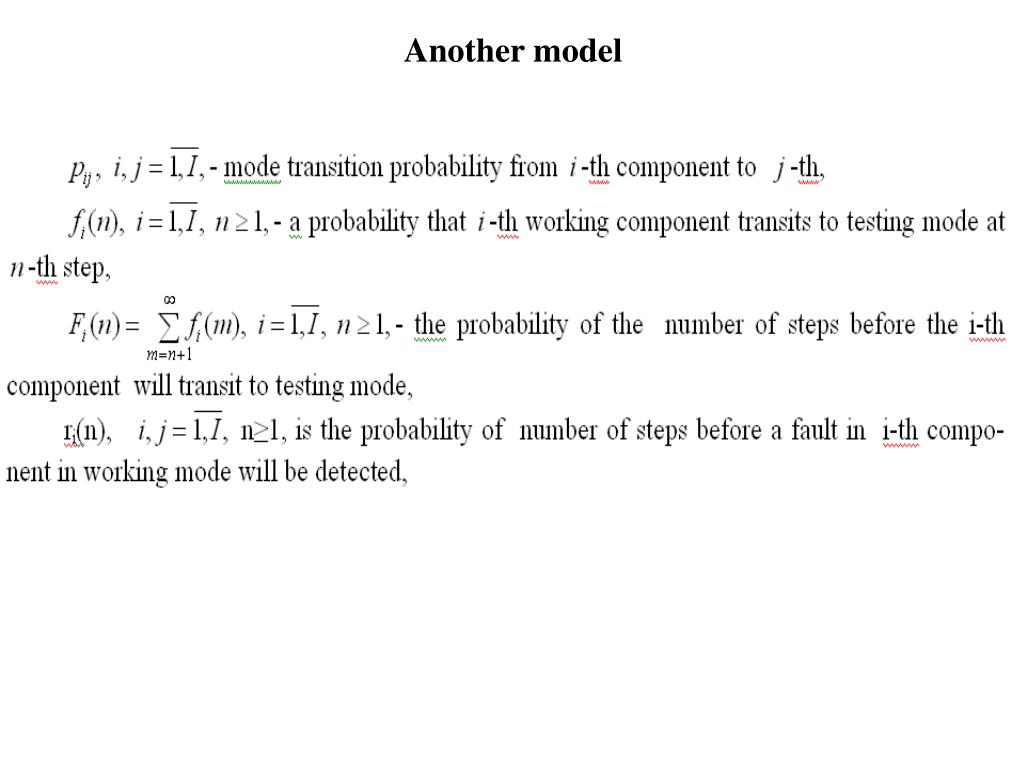 Time to absorption(S.Frenkel, A.Pechinkin, 2007) Discrete random process S(t) ={(i,j)} is non-Markovian. Let n is the time (a number of steps) elapsed from the moment of switching a component from one of mode to another. v=(w,T,T) v=(T,w,T) t n Then z(t) ={(j,j,n}} is a Markov chain. (i,j,n): Y(I,n)≠Y(j,n) is subset of absorbing states of this MC. The probability to get to the absorption state at the m-th step after a fault occurence : Pr(m) = 1- ΣijΣn=0,m Pm (i,j,n), m≥0 Pm (i,j,n) computation is recurrent one. It starts from P0(i,j,0)=0, P(i,j,n)=0, n>0, then P1(i,j,0) and P1(I,j,1), P2(i,j,1) and P2(i,j,2) etc.