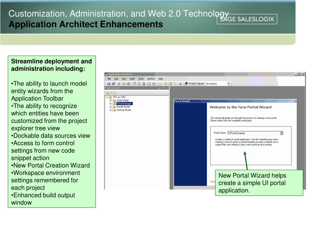 Customization, Administration, and Web 2.0 Technology Application Architect Enhancements • Streamline deployment and administration including: • The ability to launch model entity wizards from the Application Toolbar • The ability to recognize which entities have been customized from the project explorer tree view • Dockable data sources view • Access to form control settings from new code snippet action • New Portal Creation Wizard • Workspace environment settings remembered for each project • Enhanced build output window New Portal Wizard helps create a simple UI portal application.