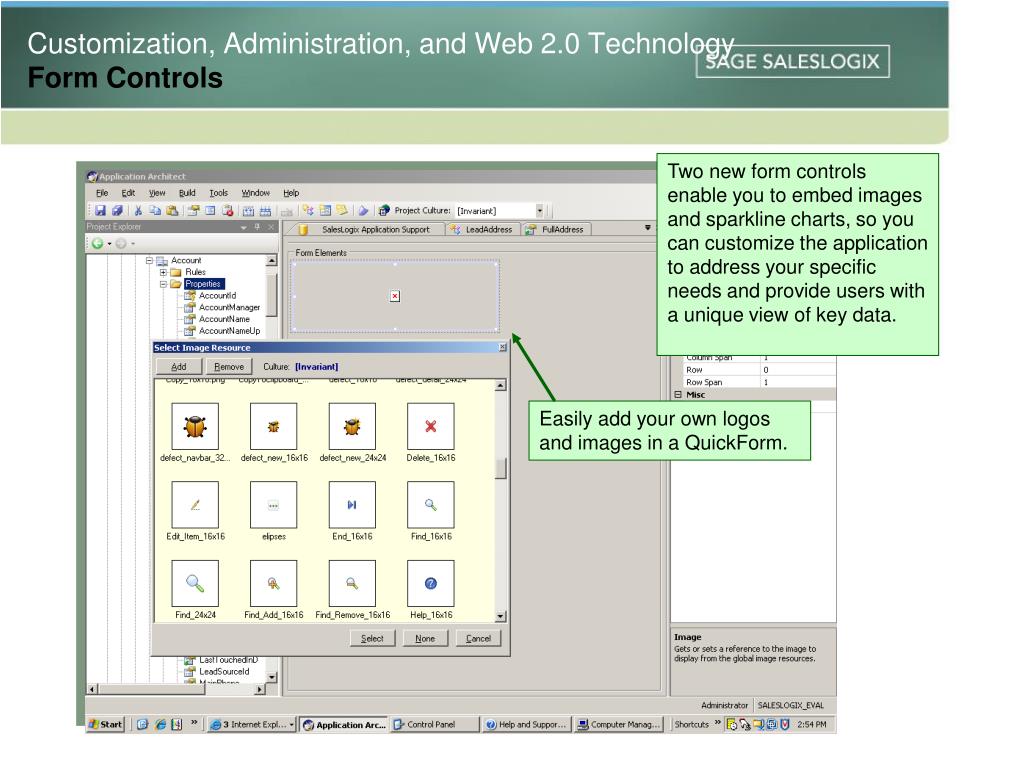 Customization, Administration, and Web 2.0 Technology Form Controls Two new form controls enable you to embed images and sparkline charts, so you can customize the application to address your specific needs and provide users with a unique view of key data. Easily add your own logos and images in a QuickForm.