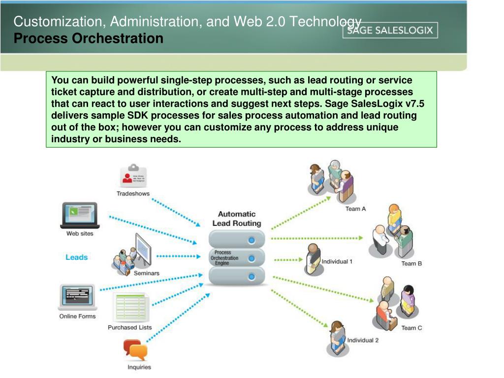 Customization, Administration, and Web 2.0 Technology Process Orchestration You can build powerful single-step processes, such as lead routing or service ticket capture and distribution, or create multi-step and multi-stage processes that can react to user interactions and suggest next steps. Sage SalesLogix v7.5 delivers sample SDK processes for sales process automation and lead routing out of the box; however you can customize any process to address unique industry or business needs.