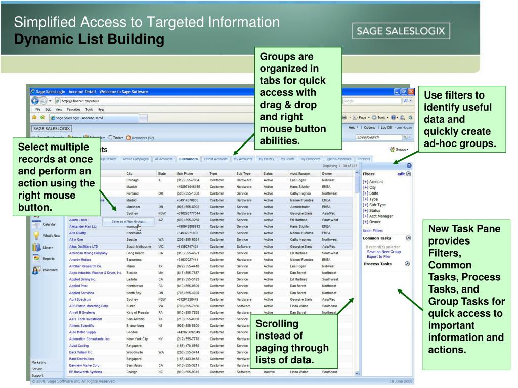 Simplified Access to Targeted InformationDynamic List Building Groups are organized in tabs for quick access with drag & drop and right mouse button abilities. Use filters to identify useful data and quickly create ad-hoc groups. Select multiple records at once and perform an action using the right mouse button. New Task Pane provides Filters, Common Tasks, Process Tasks, and Group Tasks for quick access to important information and actions. Scrolling instead of paging through lists of data.