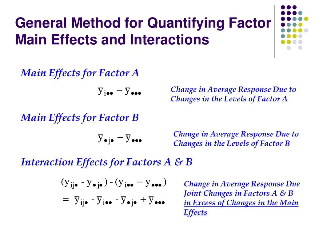 General Method for Quantifying Factor Main Effects and Interactions Main Effects for Factor A Change in Average Response Due to Changes in the Levels of Factor A Main Effects for Factor B Change in Average Response Due to Changes in the Levels of Factor B Interaction Effects for Factors A & B Change in Average Response Due Joint Changes in Factors A & B in Excess of Changes in the Main Effects