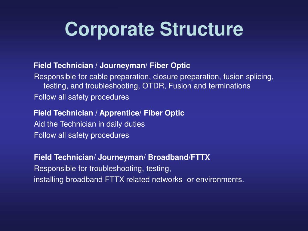 Corporate Structure Field Technician / Journeyman/ Fiber Optic Responsible for cable preparation, closure preparation, fusion splicing, testing, and troubleshooting, OTDR, Fusion and terminations Follow all safety procedures Field Technician / Apprentice/ Fiber Optic Aid the Technician in daily duties Follow all safety procedures Field Technician/ Journeyman/ Broadband/FTTX Responsible for troubleshooting, testing, installing broadband FTTX related networks or environments.