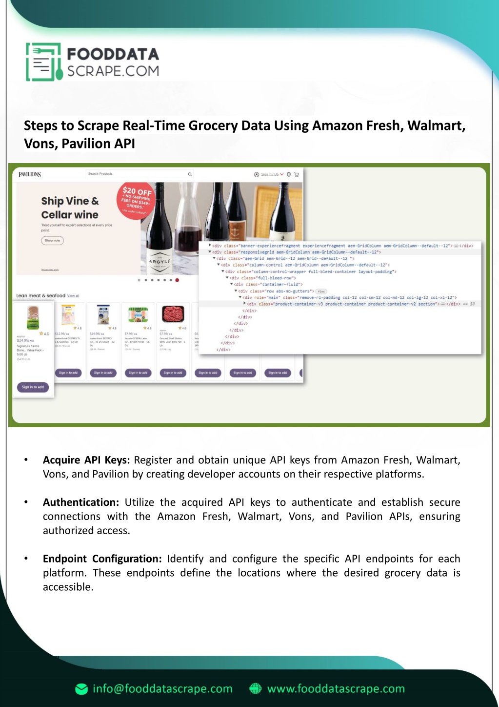 Steps to Scrape Real-Time Grocery Data Using Amazon Fresh, Walmart, Vons, Pavilion API • Acquire API Keys: Register and obtain unique API keys from Amazon Fresh, Walmart, Vons, and Pavilion by creating developer accounts on their respective platforms. • Authentication: Utilize the acquired API keys to authenticate and establish secure connections with the Amazon Fresh, Walmart, Vons, and Pavilion APIs, ensuring authorized access. • Endpoint Configuration: Identify and configure the specific API endpoints for each platform. These endpoints define the locations where the desired grocery data is accessible.