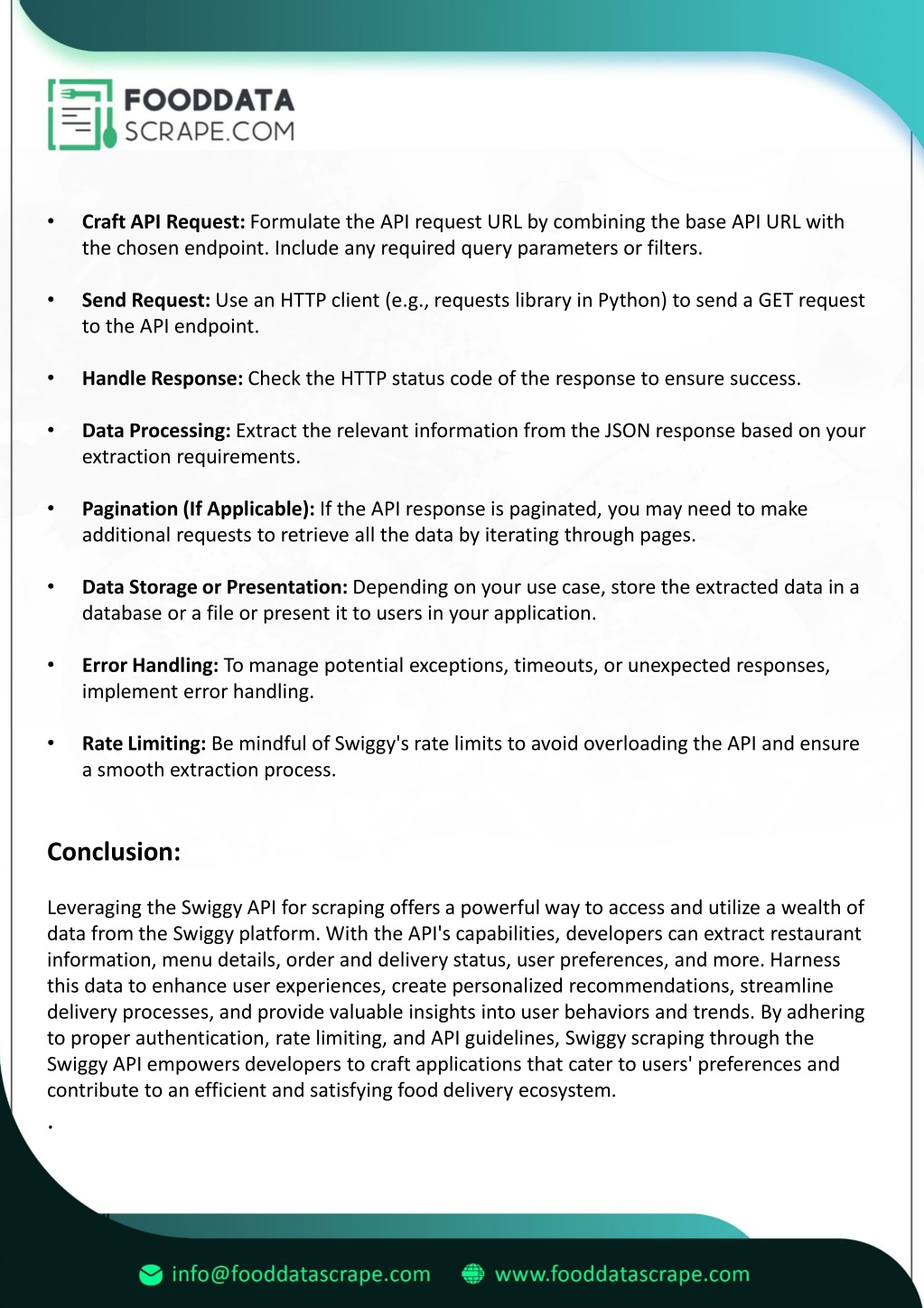 Craft API Request: Formulate the API request URL by combining the base API URL with the chosen endpoint. Include any required query parameters or filters. • Send Request: Use an HTTP client (e.g., requests library in Python) to send a GET request to the API endpoint. • Handle Response: Check the HTTP status code of the response to ensure success. • Data Processing: Extract the relevant information from the JSON response based on your extraction requirements. • Pagination (If Applicable): If the API response is paginated, you may need to make additional requests to retrieve all the data by iterating through pages. • Data Storage or Presentation: Depending on your use case, store the extracted data in a database or a file or present it to users in your application. • Error Handling: To manage potential exceptions, timeouts, or unexpected responses, implement error handling. • Rate Limiting: Be mindful of Swiggy's rate limits to avoid overloading the API and ensure a smooth extraction process. • Conclusion: • Leveraging the Swiggy API for scraping offers a powerful way to access and utilize a wealth of data from the Swiggy platform. With the API's capabilities, developers can extract restaurant information, menu details, order and delivery status, user preferences, and more. Harness this data to enhance user experiences, create personalized recommendations, streamline delivery processes, and provide valuable insights into user behaviors and trends. By adhering to proper authentication, rate limiting, and API guidelines, Swiggy scraping through the Swiggy API empowers developers to craft applications that cater to users' preferences and contribute to an efficient and satisfying food delivery ecosystem. • .