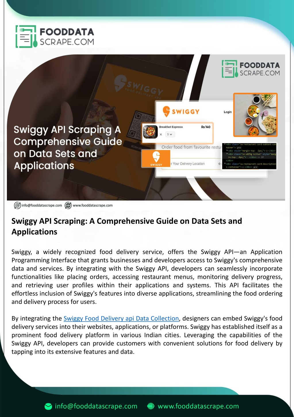 Swiggy API Scraping: A Comprehensive Guide on Data Sets and Applications Swiggy, a widely recognized food delivery service, offers the Swiggy API—an Application Programming Interface that grants businesses and developers access to Swiggy's comprehensive data and services. By integrating with the Swiggy API, developers can seamlessly incorporate functionalities like placing orders, accessing restaurant menus, monitoring delivery progress, and retrieving user profiles within their applications and systems. This API facilitates the effortless inclusion of Swiggy's features into diverse applications, streamlining the food ordering and delivery process for users. By integrating the Swiggy Food Delivery api Data Collection, designers can embed Swiggy's food delivery services into their websites, applications, or platforms. Swiggy has established itself as a prominent food delivery platform in various Indian cities. Leveraging the capabilities of the Swiggy API, developers can provide customers with convenient solutions for food delivery by tapping into its extensive features and data.