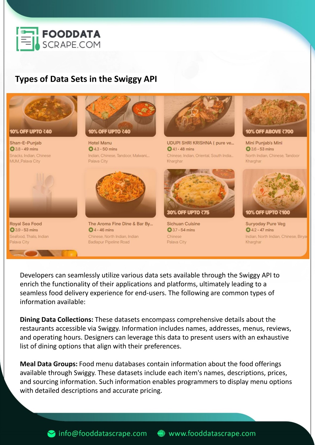 Types of Data Sets in the Swiggy API Developers can seamlessly utilize various data sets available through the Swiggy API to enrich the functionality of their applications and platforms, ultimately leading to a seamless food delivery experience for end-users. The following are common types of information available: Dining Data Collections: These datasets encompass comprehensive details about the restaurants accessible via Swiggy. Information includes names, addresses, menus, reviews, and operating hours. Designers can leverage this data to present users with an exhaustive list of dining options that align with their preferences. Meal Data Groups: Food menu databases contain information about the food offerings available through Swiggy. These datasets include each item's names, descriptions, prices, and sourcing information. Such information enables programmers to display menu options with detailed descriptions and accurate pricing.