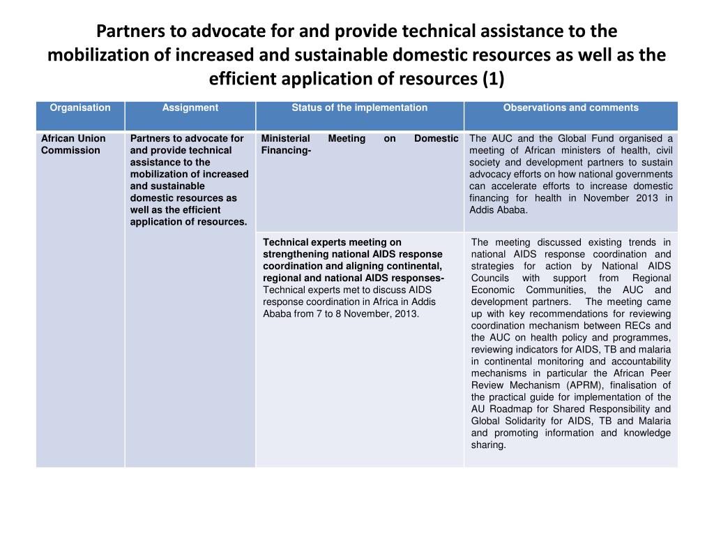 Partners to advocate for and provide technical assistance to the mobilization of increased and sustainable domestic resources as well as the efficient application of resources (1)
