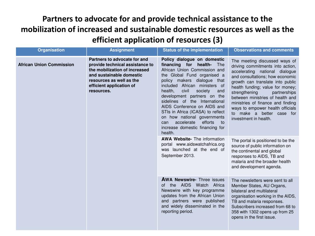 Partners to advocate for and provide technical assistance to the mobilization of increased and sustainable domestic resources as well as the efficient application of resources (3)