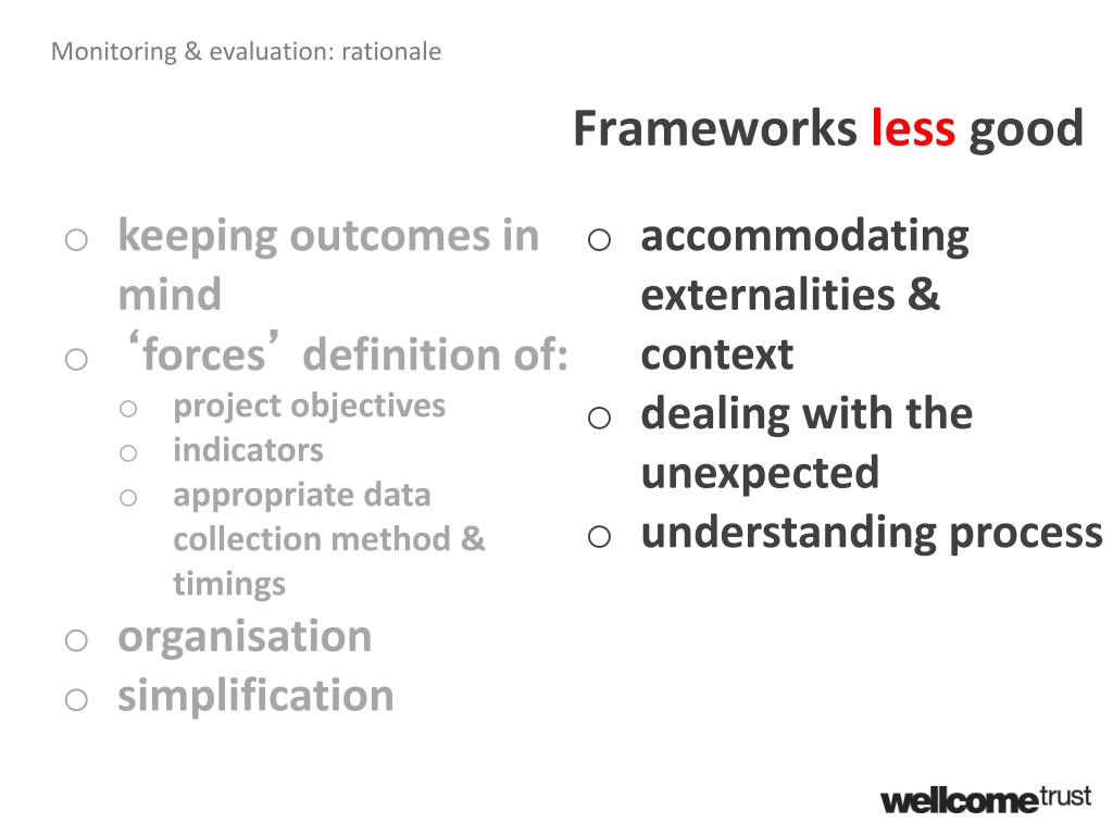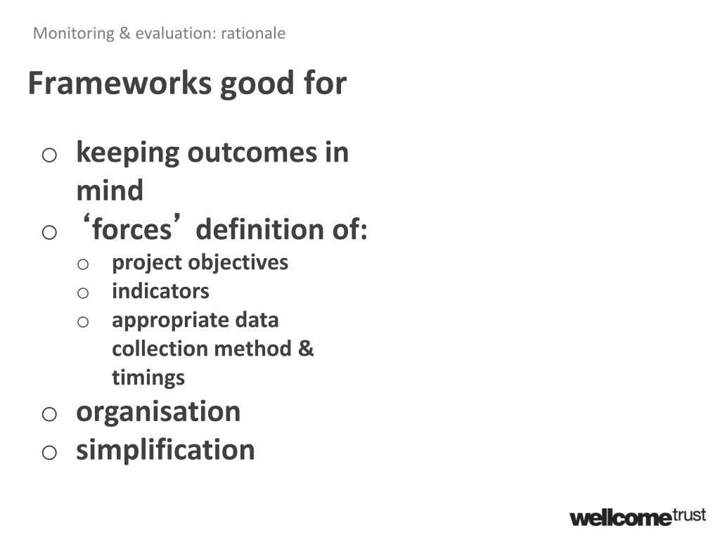 Monitoring & evaluation: rationale Frameworks less good • keeping outcomes in mind • ‘forces’ definition of: • project objectives • indicators • appropriate data collection method & timings • organisation • simplification • accommodating externalities & context • dealing with the unexpected • understanding process