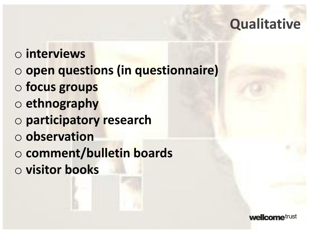 Qualitative • interviews • open questions (in questionnaire) • focus groups • ethnography • participatory research • observation • comment/bulletin boards • visitor books
