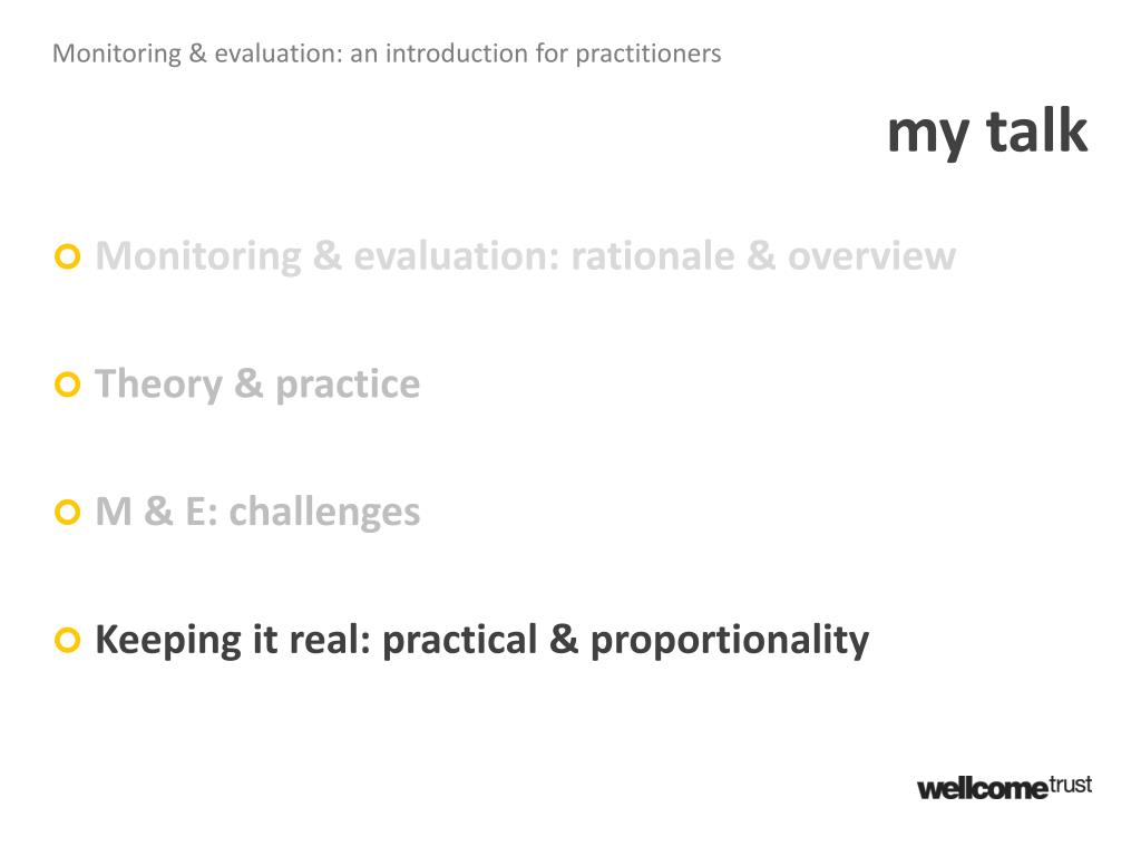 Monitoring & evaluation: an introduction for practitioners my talk • Monitoring & evaluation: rationale & overview • Theory & practice • M & E: challenges • Keeping it real: practical & proportionality