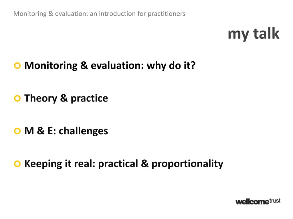 Monitoring & evaluation: an introduction for practitioners my talk • Monitoring & evaluation: why do it? • Theory & practice • M & E: challenges • Keeping it real: practical & proportionality
