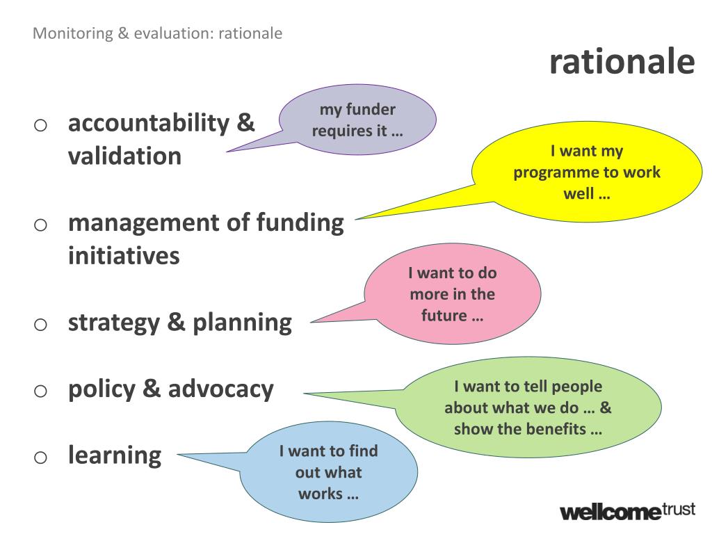 Monitoring & evaluation: rationale rationale my funder requires it … • accountability & validation • management of funding initiatives • strategy & planning • policy & advocacy • learning I want my programme to work well … I want to do more in the future … I want to tell people about what we do … & show the benefits … I want to find out what works …