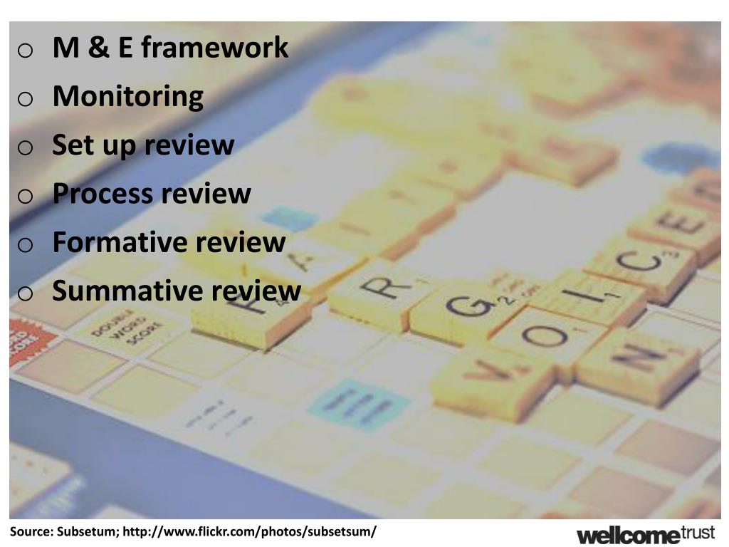M & E framework • Monitoring • Set up review • Process review • Formative review • Summative review Source: Subsetum; http://www.flickr.com/photos/subsetsum/
