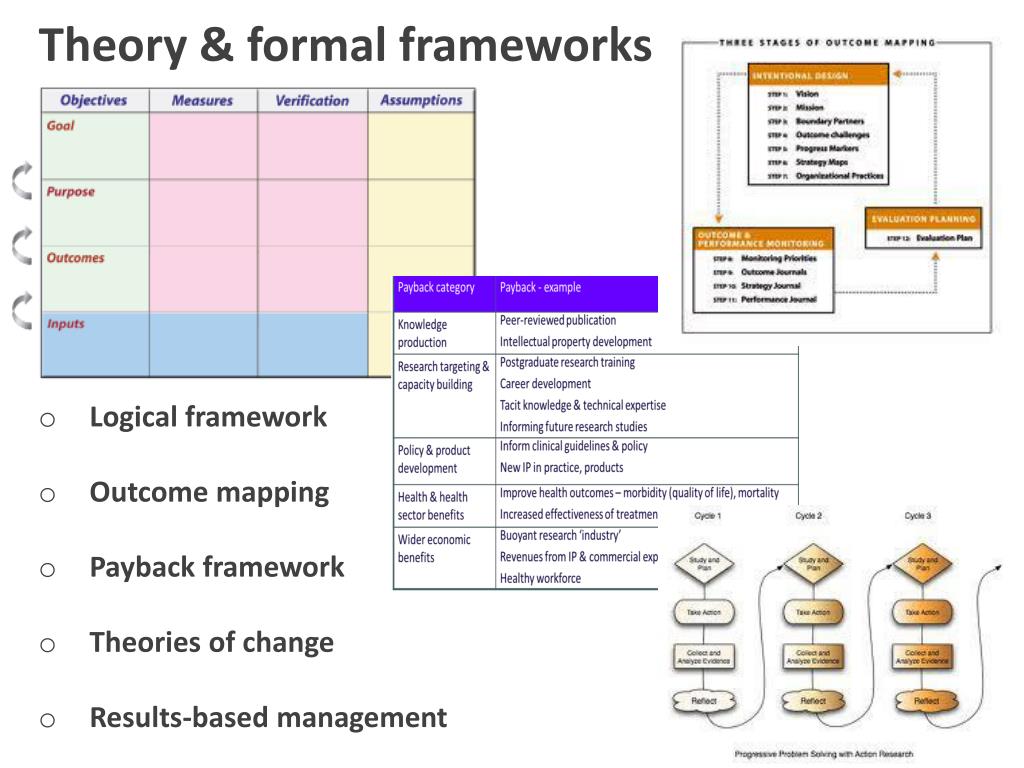Theory & formal frameworks • Logical framework • Outcome mapping • Payback framework • Theories of change • Results-based management