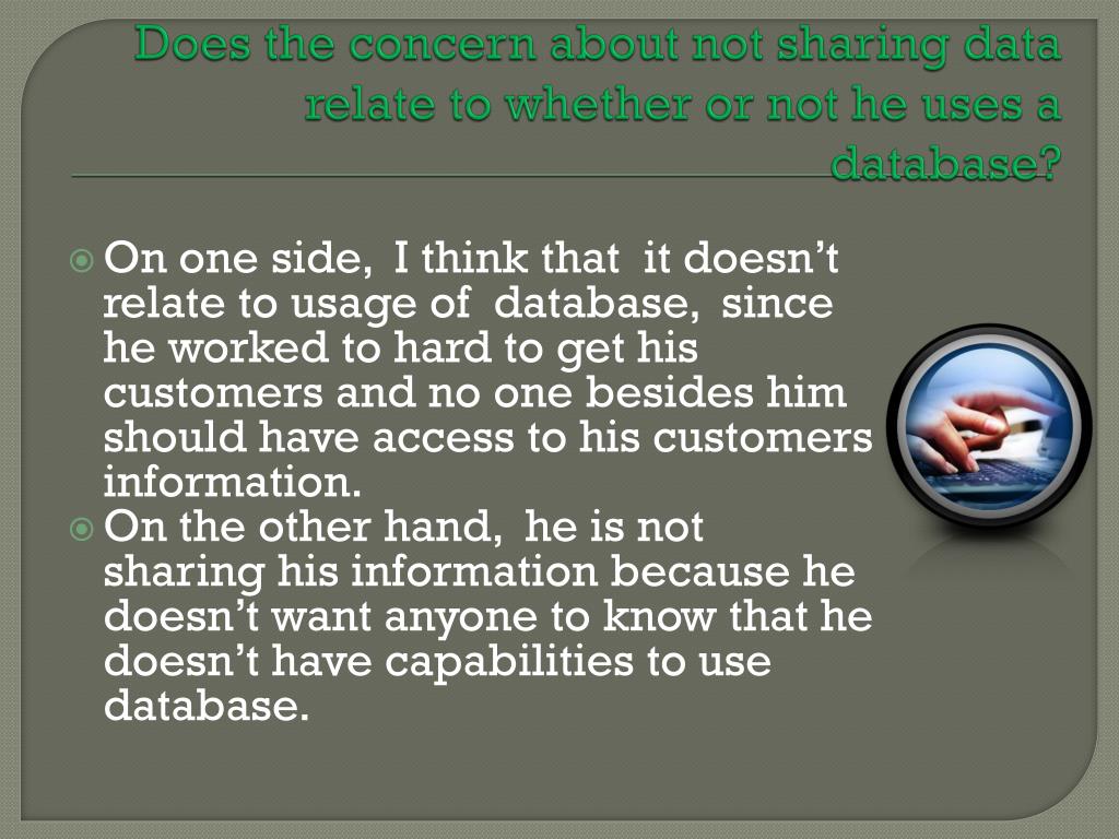 Does the concern about not sharing data relate to whether or not he uses a database? • On one side, I think that it doesn’t relate to usage of database, since he worked to hard to get his customers and no one besides him should have access to his customers information. • On the other hand, he is not sharing his information because he doesn’t want anyone to know that he doesn’t have capabilities to use database.