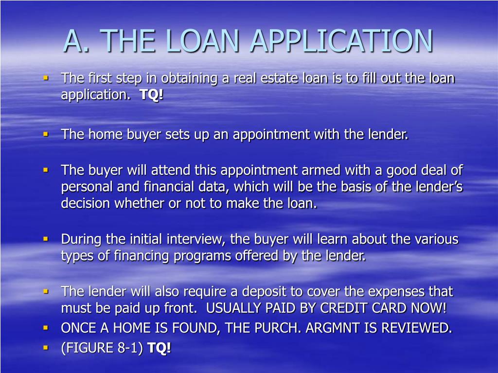 REAL ESTATE FINANCE PRESENTATION 6. CHAPTERS 8 & 9 Loan Processing Conventional Financing. Chapter 8. Overview of the Loan Process. I. The Loan Process. A. THE LOAN APPLICATION. The first step in obtaining a real estate loan is to fill out the loan application. TQ!