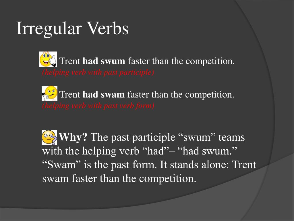 Irregular Verbs Trent had swum faster than the competition. (helping verb with past participle) Trent had swam faster than the competition. (helping verb with past verb form) Why? The past participle “swum” teams with the helping verb “had”– “had swum.” “Swam” is the past form. It stands alone: Trent swam faster than the competition.
