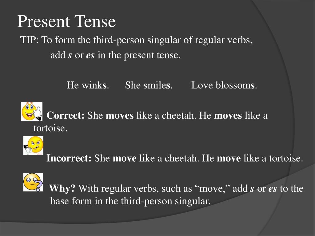 Present Tense TIP: To form the third-person singular of regular verbs, add sor es in the present tense. He winks. She smiles. Love blossoms. Correct: She moves like a cheetah. He moves like a tortoise. Incorrect: She move like a cheetah. He move like a tortoise. Why? With regular verbs, such as “move,” add s or es to the base form in the third-person singular.