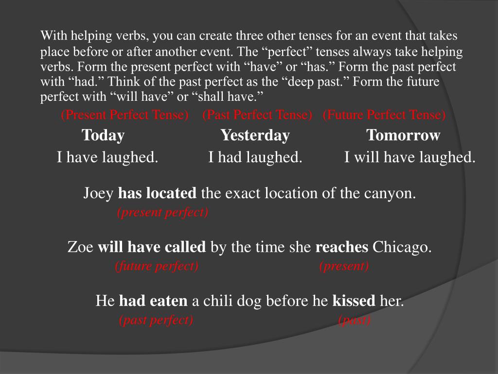 With helping verbs, you can create three other tenses for an event that takes place before or after another event. The “perfect” tenses always take helping verbs. Form the present perfect with “have” or “has.” Form the past perfect with “had.” Think of the past perfect as the “deep past.” Form the future perfect with “will have” or “shall have.” (Present Perfect Tense) (Past Perfect Tense) (Future Perfect Tense) Today Yesterday Tomorrow I have laughed. I had laughed. I will have laughed. Joey has located the exact location of the canyon. (present perfect) Zoe will have called by the time she reaches Chicago. (future perfect) (present) He had eaten a chili dog before he kissed her. (past perfect) (past)