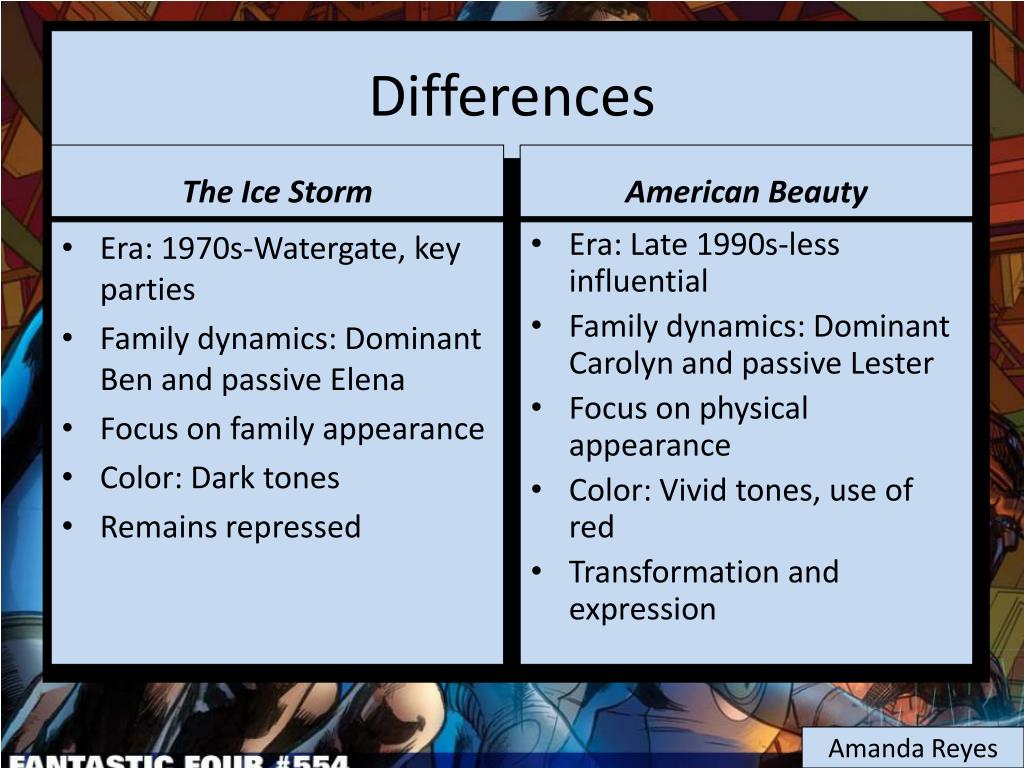 Differences The Ice Storm American Beauty Era: Late 1990s-less influential Family dynamics: Dominant Carolyn and passive Lester Focus on physical appearance Color: Vivid tones, use of red Transformation and expression • Era: 1970s-Watergate, key parties • Family dynamics: Dominant Ben and passive Elena • Focus on family appearance • Color: Dark tones • Remains repressed Amanda Reyes