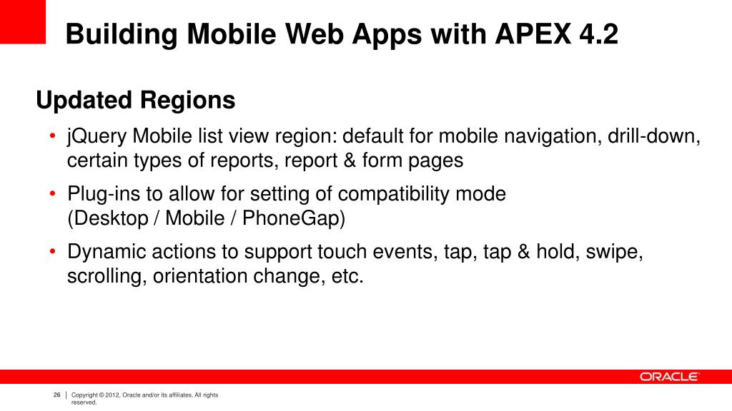 Building Mobile Web Apps with APEX 4.2 • Updated Regions • jQuery Mobile list view region: default for mobile navigation, drill-down, certain types of reports, report & form pages • Plug-ins to allow for setting of compatibility mode (Desktop / Mobile / PhoneGap) • Dynamic actions to support touch events, tap, tap & hold, swipe, scrolling, orientation change, etc.