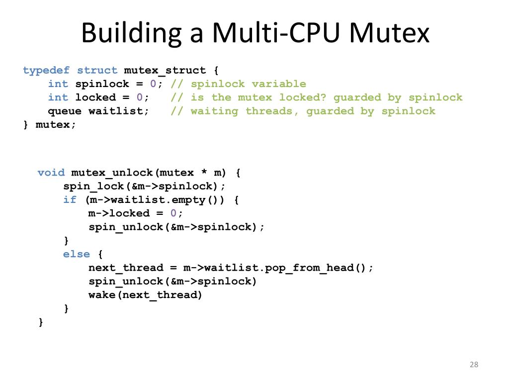 Building a Multi-CPU Mutex • typedefstructmutex_struct { • intspinlock = 0; // spinlock variable • intlocked = 0;// is the mutex locked? guarded by spinlock • queue waitlist;// waiting threads, guarded by spinlock • } mutex; • voidmutex_lock(mutex * m) { • spin_lock(&m->spinlock); • if (!m->locked){ • m->locked = 1; • spin_unlock(&m->spinlock); • break; • } • else { • pause(current_process); • m->waitlist.add(current_process); • spin_unlock(&m->spinlock); • yield(); • // wake up here when the mutex is acquired • } • } • voidmutex_unlock(mutex * m) { • spin_lock(&m->spinlock); • if (m->waitlist.empty()) { • m->locked = 0; • spin_unlock(&m->spinlock); • } • else { • next_thread = m->waitlist.pop_from_head(); • spin_unlock(&m->spinlock) • wake(next_thread) • } • }