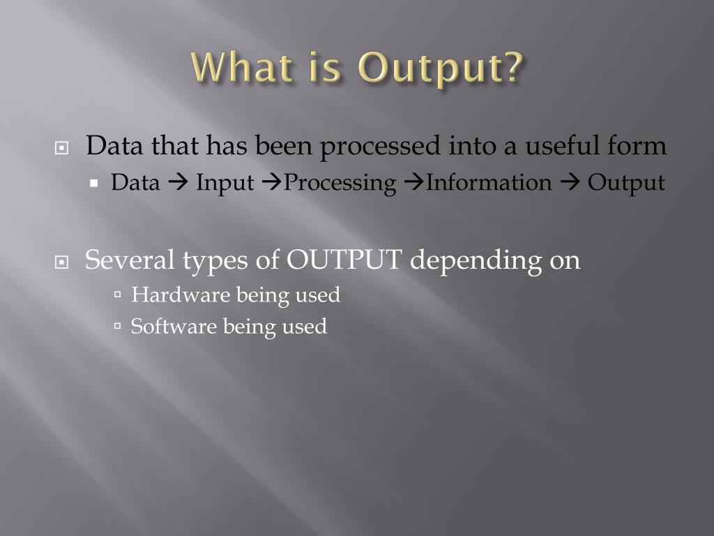 What is Output? • Data that has been processed into a useful form • Data Input Processing Information Output • Several types of OUTPUT depending on • Hardware being used • Software being used