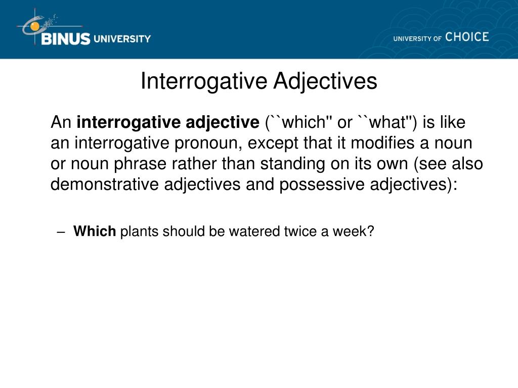 Interrogative Adjectives An interrogative adjective (``which'' or ``what'') is like an interrogative pronoun, except that it modifies a noun or noun phrase rather than standing on its own (see also demonstrative adjectives and possessive adjectives): • Which plants should be watered twice a week?