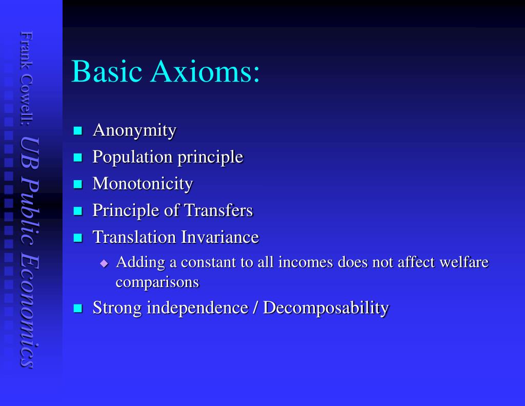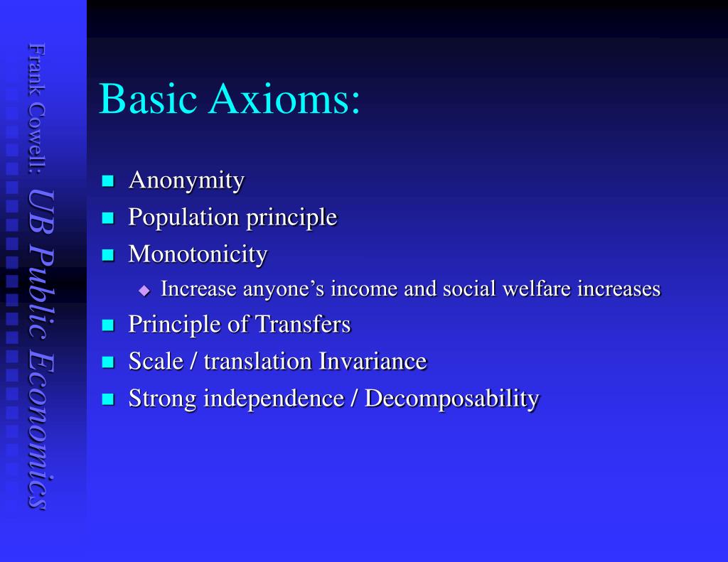 Basic Axioms: • Anonymity • Permute the individuals and social welfare does not change • Population principle • Monotonicity • Principle of Transfers • Scale / translation Invariance • Strong independence / Decomposability