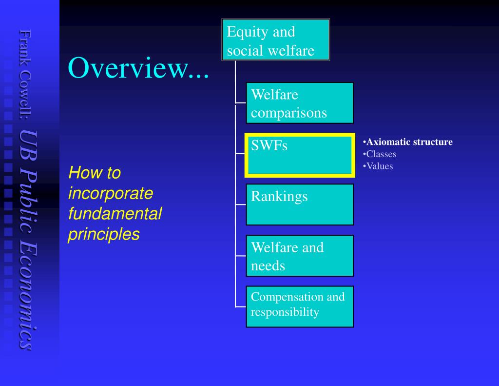 Equity and social welfare Overview... Welfare comparisons SWFs • Axiomatic structure • Classes • Values How to incorporate fundamental principles Rankings Welfare and needs Compensation and responsibility