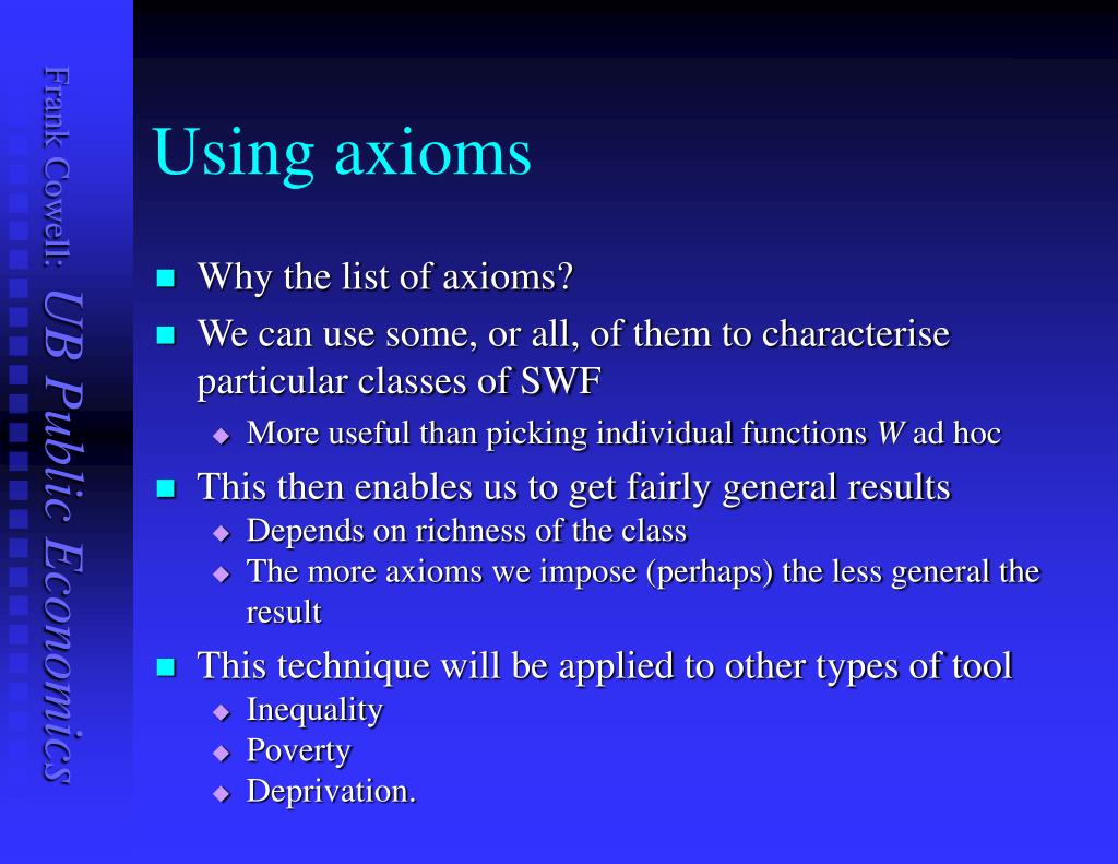 Using axioms • Why the list of axioms? • We can use some, or all, of them to characterise particular classes of SWF • More useful than picking individual functions W ad hoc • This then enables us to get fairly general results • Depends on richness of the class • The more axioms we impose (perhaps) the less general the result • This technique will be applied to other types of tool • Inequality • Poverty • Deprivation.